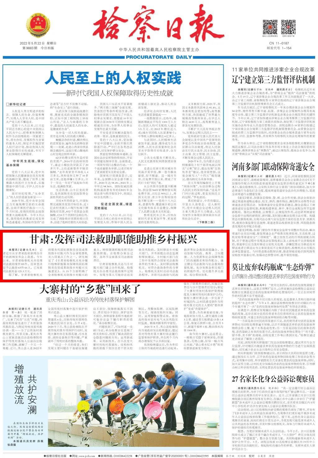 2022年5月22日,检察日报头版刊发《甘肃:发挥司法救助职能助推乡村振兴》