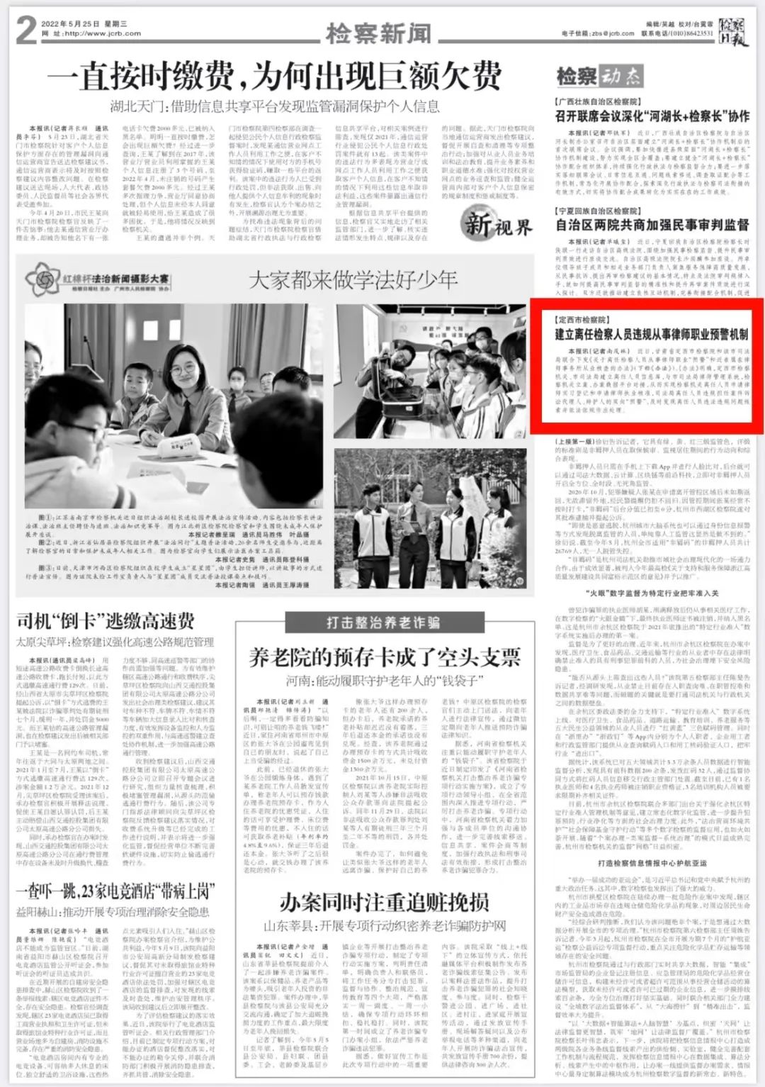 2022年5月25日,检察日报二版刊发《定西市司机社:建立离任检察人员违规从事律师职业预警机制》。