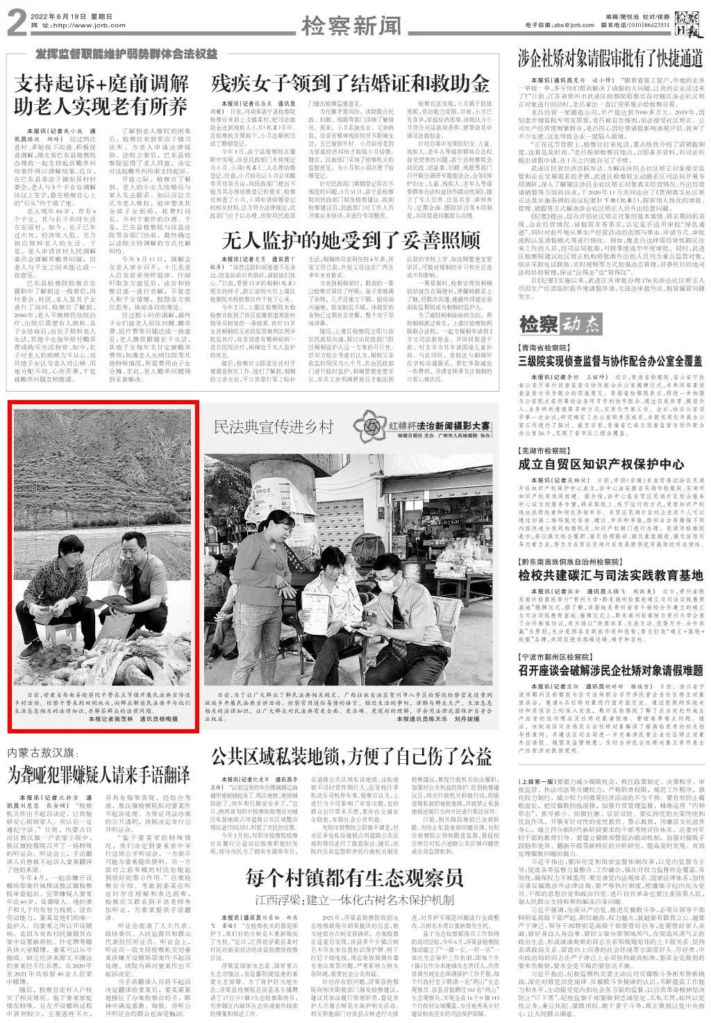 2022年6月19日,检察日报二版刊发图片新闻《民法典宣传进乡村》。