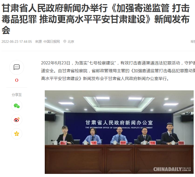 2022年6月23日,中国日报网发布《甘肃省人民政府新闻办举行〈加强寄递监管 打击毒品犯罪 推动更高水平平安甘肃建设〉新闻发布会》。