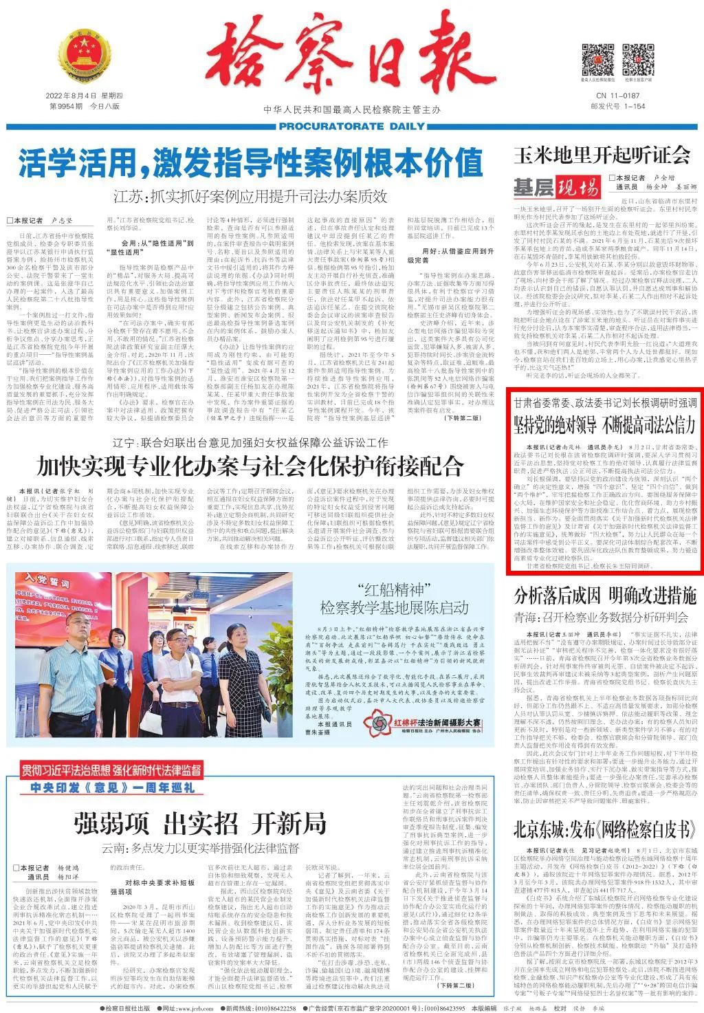 2022年8月4日,检察日报头版刊发《甘肃省委常委、政法委书记刘长根调研时强调:坚持党的绝对领导 不断提高司法公信力》。