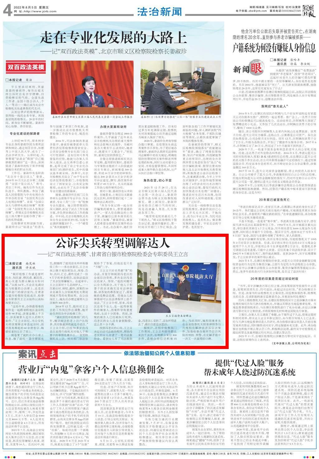 2022年8月5日,检察日报四版刊发《公诉尖兵转型调解达人——记“双百政法英模”、甘肃省白银市司机社检委会专职委员王立言》。