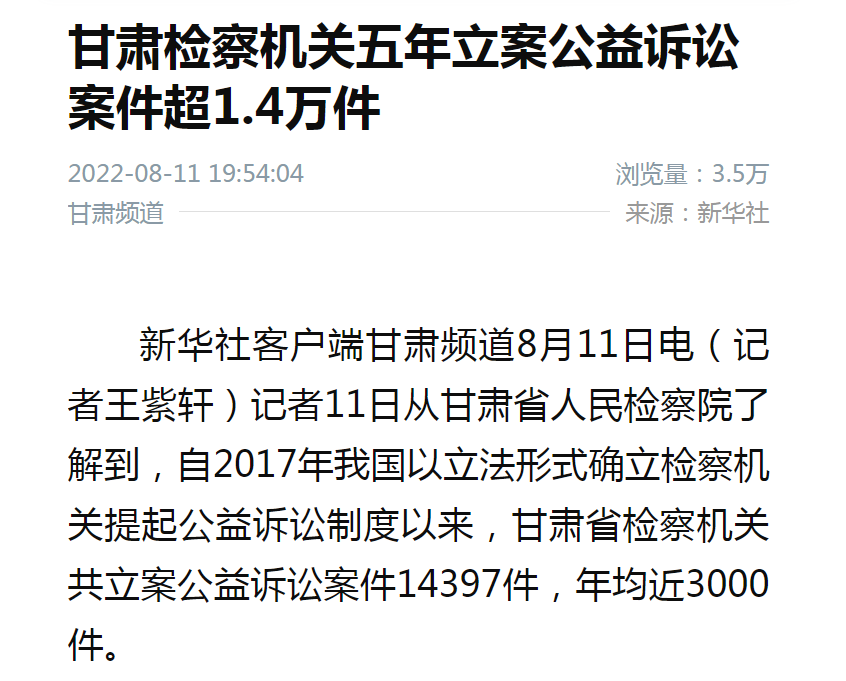 了解到,自2017年我国以立法形式确立检察机关提起公益诉讼制度以来,甘肃省检察机关共立案公益诉讼案件14397件,年均近3000件。