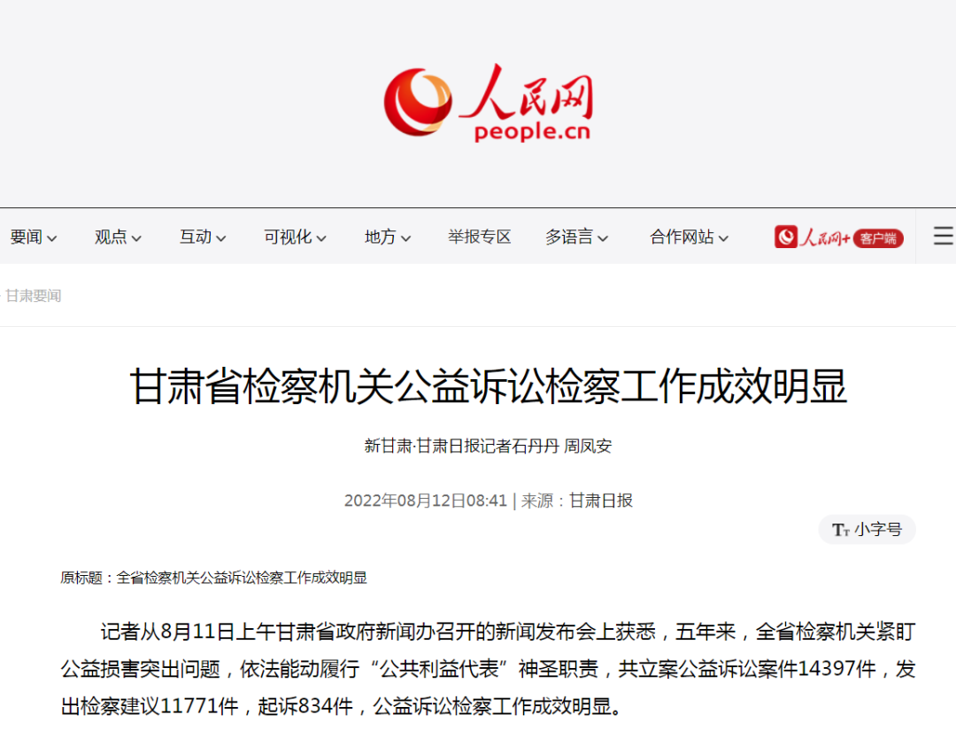 2022年8月12日,人民网发布《甘肃省检察机关公益诉讼检察工作成效明显》。