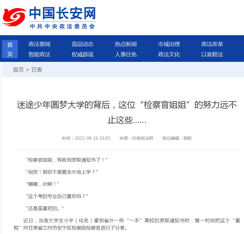 2022年8月16日,中国长安网发布《迷途少年圆梦大学的背后,这位“检察官姐姐”的努力远不止这些……》。
