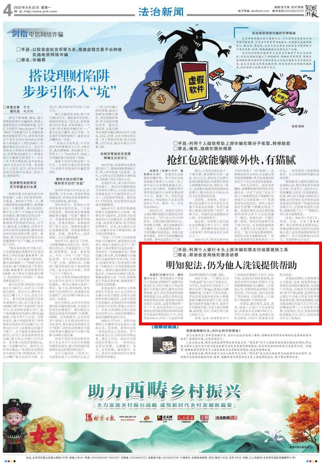 2022年8月22日,检察日报四版刊发《明知犯法,仍为他人洗钱提供帮助》。