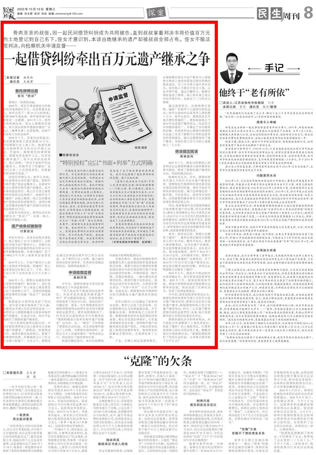 2022年10月19日,检察日报民生周刊刊发《一起借贷纠纷牵出百万元遗产继承之争》。