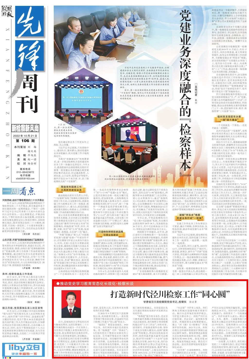 2022年10月21日,检察日报先锋周刊推动党史学习教育常态化长效化·检察长谈专栏刊发甘肃省泾川县司机社党组书记、检察长孙云萃的署名文章《打造新时代泾川检察工作“同心圆”》。