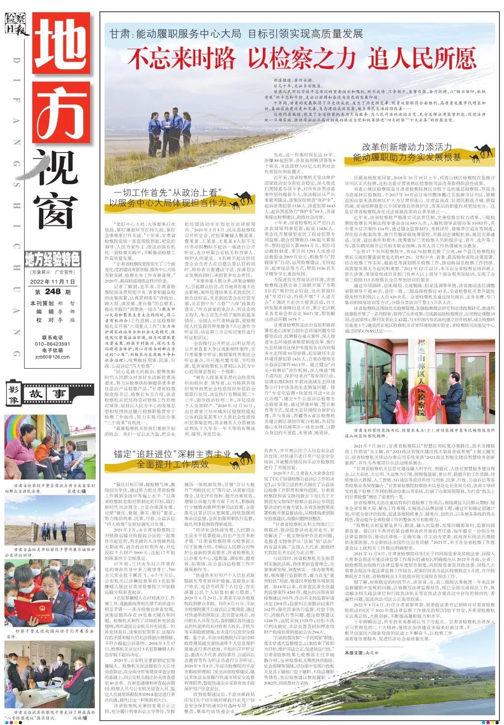 2022年11月1日,检察日报九版整版刊发《不忘来时路 以检察之力 追人民所愿——甘肃:能动履职服务中心大局 目标引领实现高质量发展》。