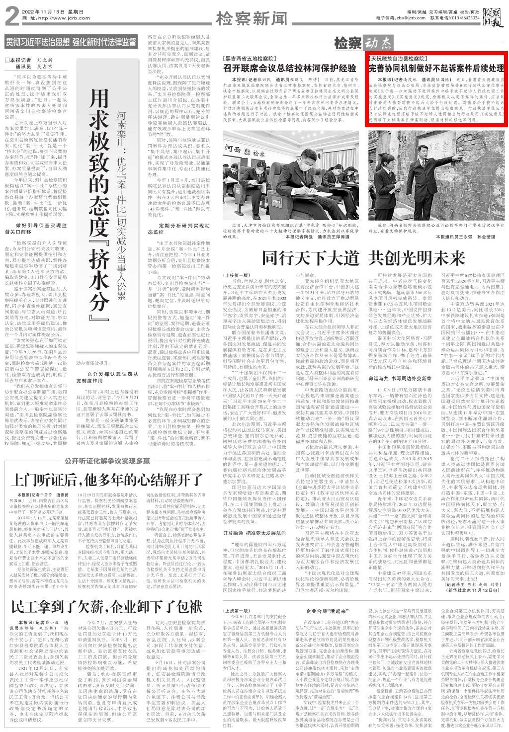 2022年11月13日,检察日报二版刊发《天祝藏族自治县司机社:完善协同机制做好不起诉案件后续处理》。