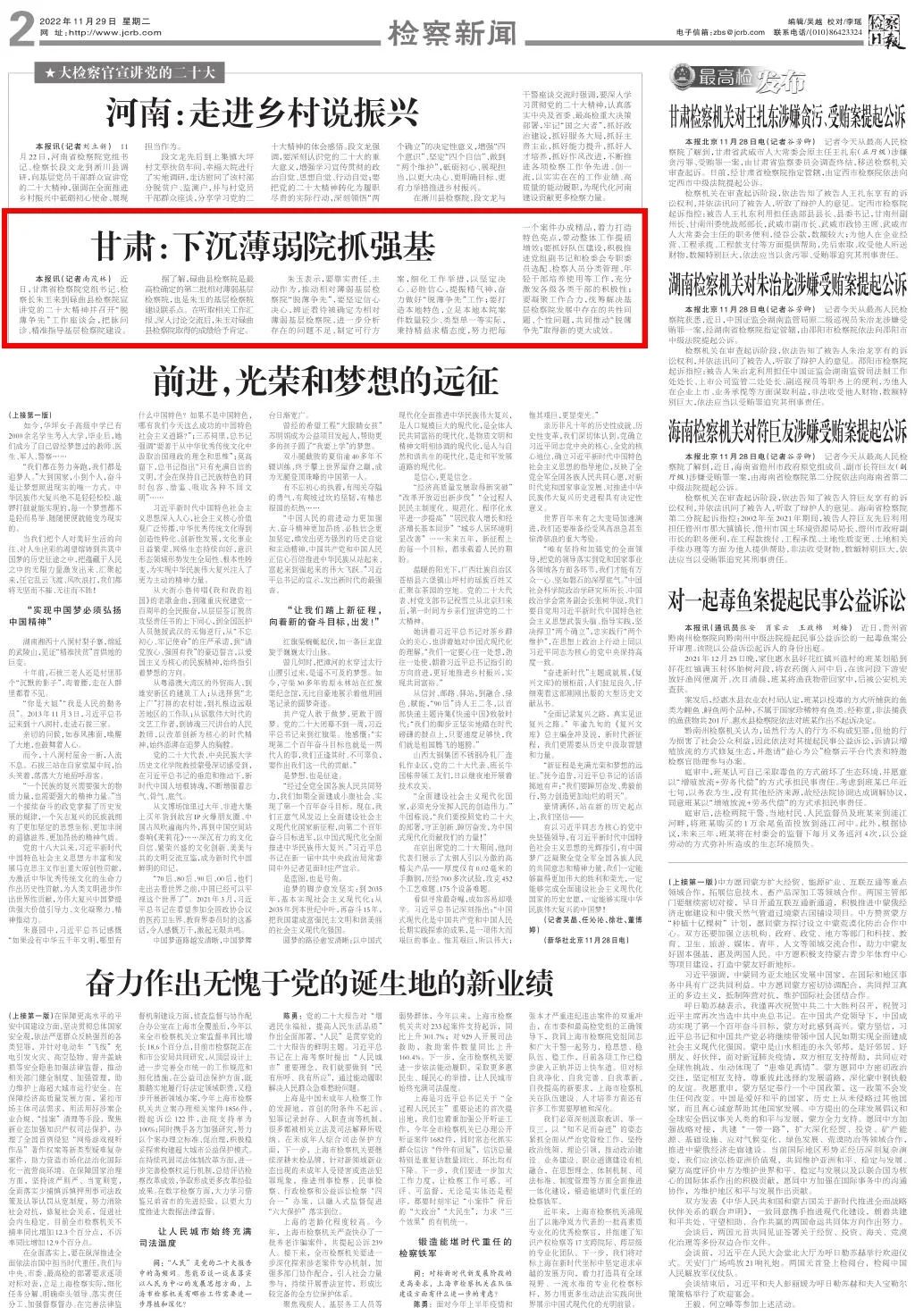 2022年11月29日,检察日报二版刊发《甘肃:下沉薄弱院抓强基》。