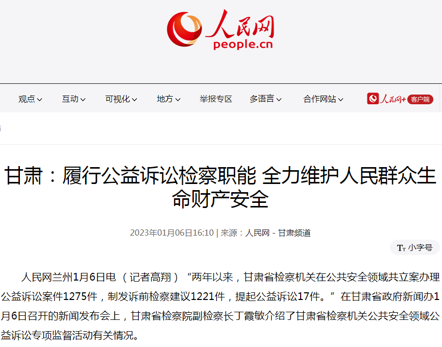 2023年1月6日,人民网发布《甘肃:履行公益诉讼检察职能 全力维护人民群众生命财产安全》。