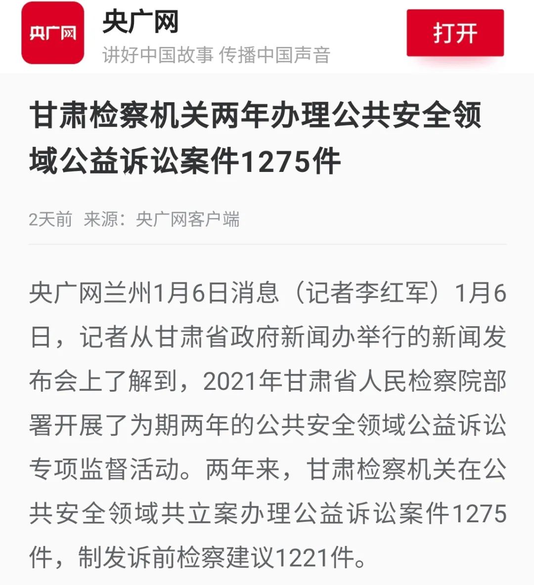 机关两年办理公共安全领域公益诉讼案件1275件》。
