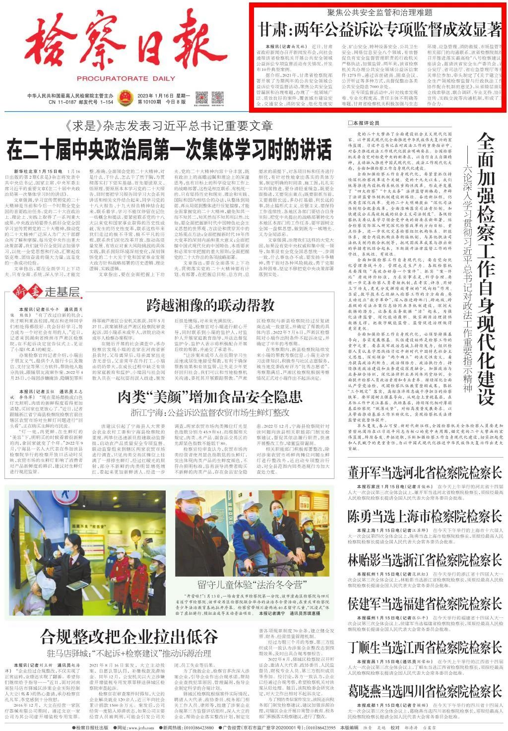 2023年1月16日,检察日报头版刊发《聚焦公共安全监管和治理难题——甘肃:两年公益诉讼专项监督成效显著》。