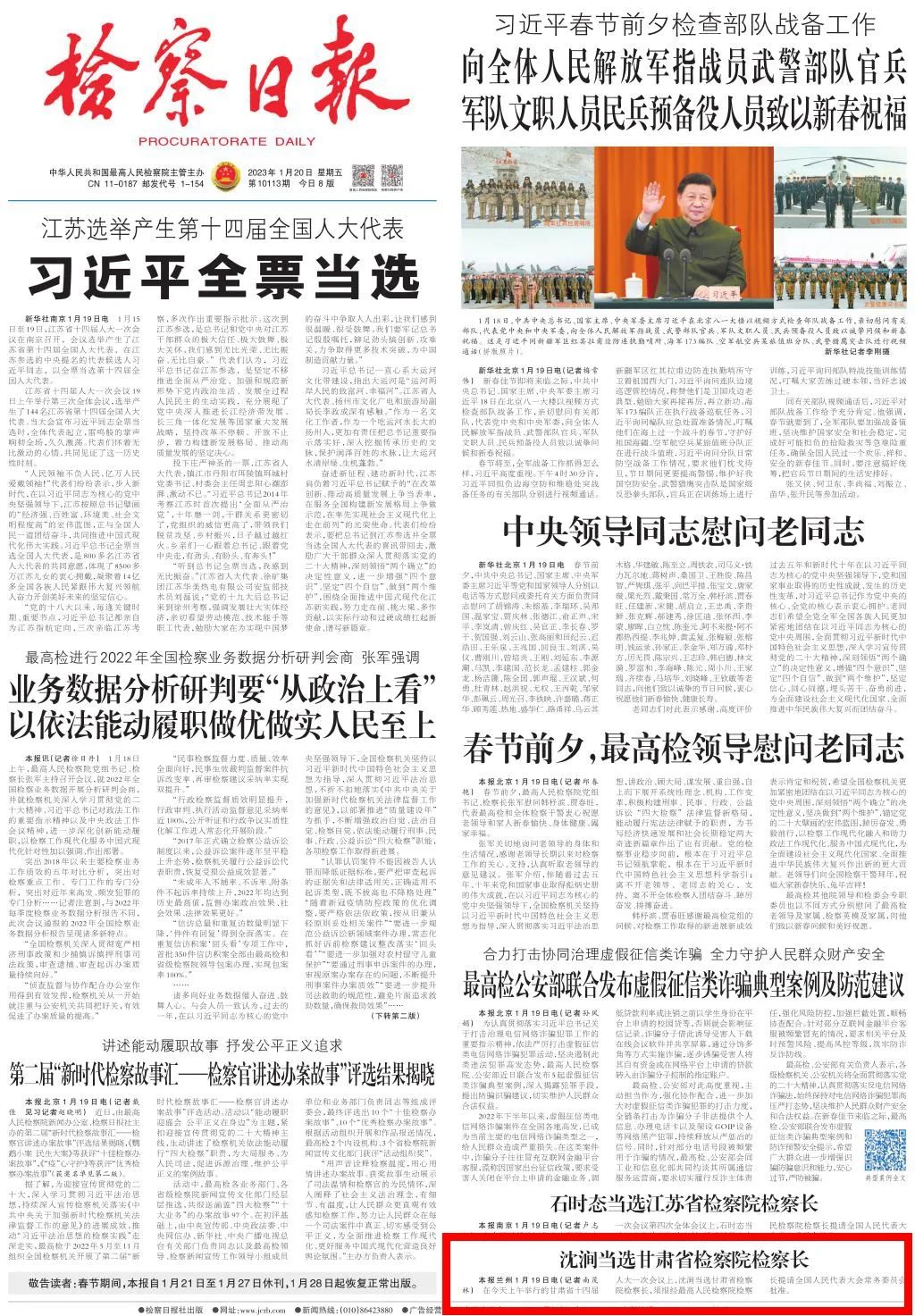 2023年1月20日,检察日报头版刊发《沈涧当选司机社 检察长》。