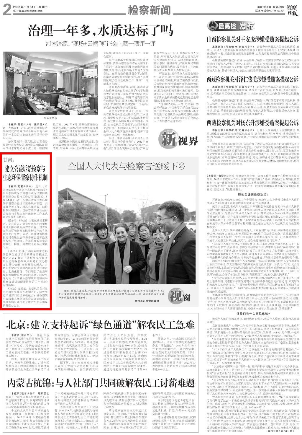 2023年1月31日,检察日报二版刊发《甘肃:建立公益诉讼检察与生态环保督察协作机制》。