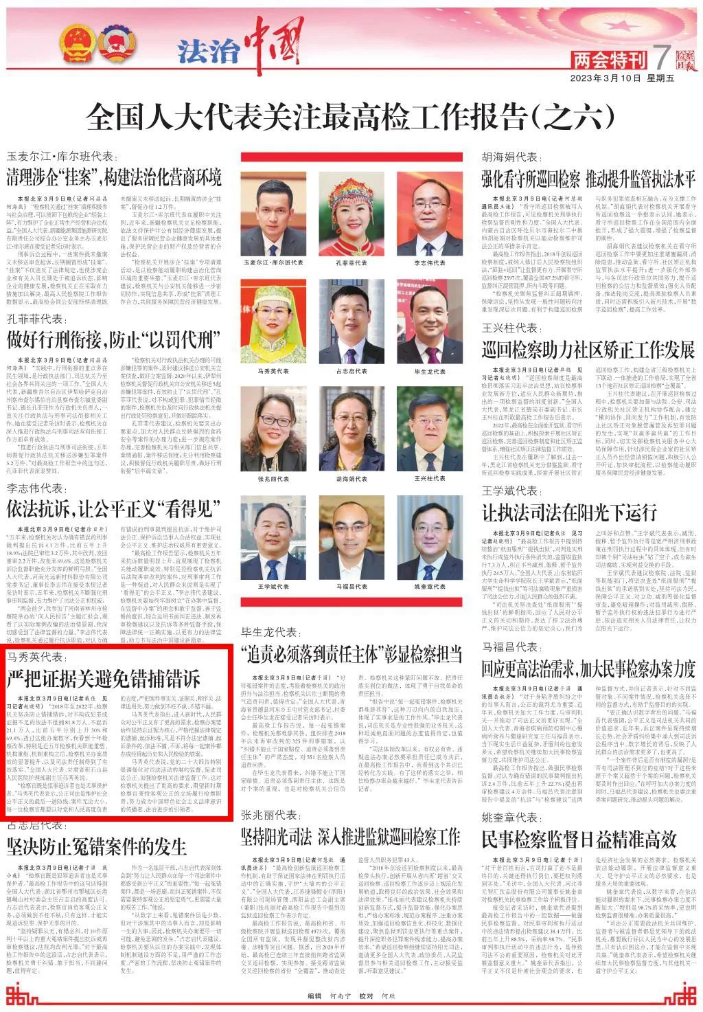 2023年3月10日,检察日报《法治中国两会特刊》刊发《马秀英代表:严把证据关避免错捕错诉》。