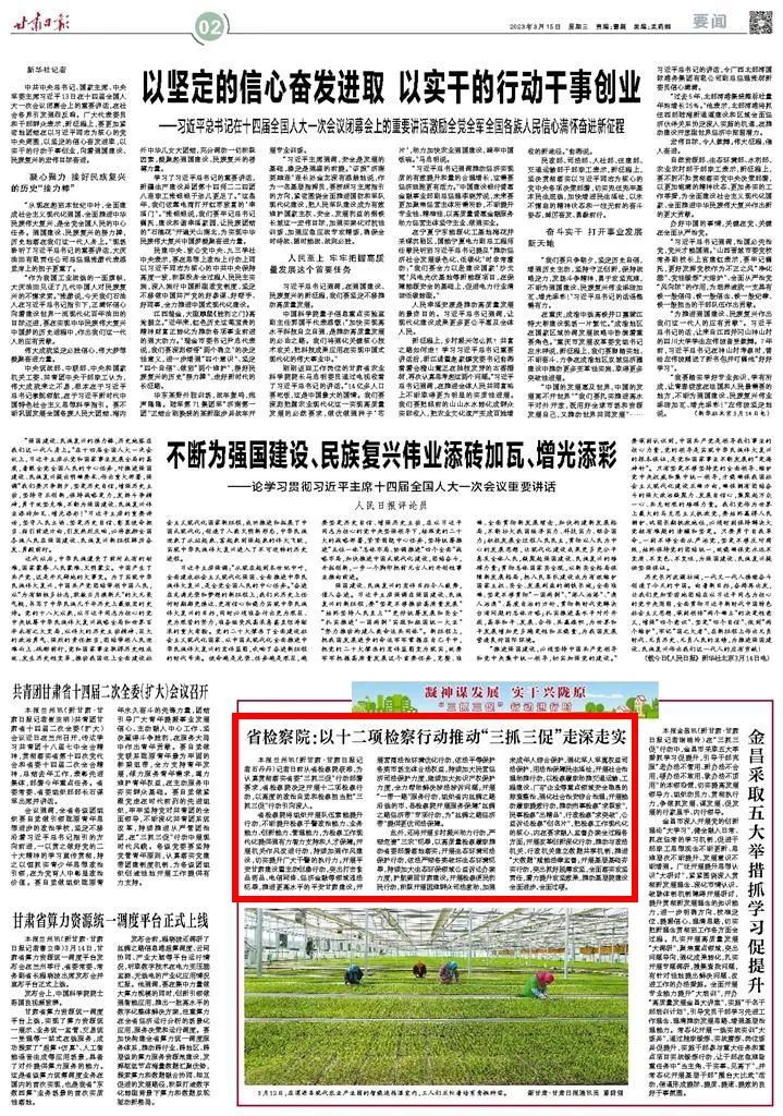 此外,还将开展乡村振兴助力行动,严惩危害“三农”犯罪,以高质量检察履职推动省委部署落地落实;开展生态环境司法保护行动,依法严惩各类破坏生态环境犯罪,持续加大生态环保领域公益诉讼办案力度,护航美丽甘肃建设;开展检察便民利民行动,积极开展困难群众司法救助,加强未成年人综合保护,强化军人军属权益司法保护,用法治保障民生福祉;开展社会治理助推行动,以检察履职助推交通运输、工程建设、厂矿企业等重点领域安全隐患的排查整治,强化社会治安综合治理;开展能动履职提效行动,推动刑事检察“求极致”,民事检察“出精品”,行政检察“求突破”,公益诉讼检察“创名片”,把检察工作现代化的核心、内在要求融入监督办案全过程各方面;开展改革创新深化行动,推动与政法机关、行政机关建立数据共享机制,推进“大数据”赋能法律监督;开展基层基础夯实行动,突出抓好脱薄攻坚,全面落实攻坚责任,着力提升攻坚效果,推动基层院建设全面进步、全面过硬。