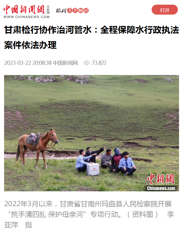 2023年3月22日,中国新闻网发布《甘肃检行协作治河管水:全程保障水行政执法案件依法办理》。