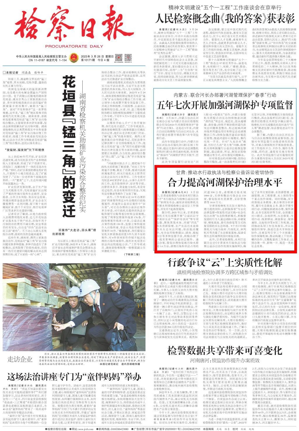 2023年3月26日,检察日报头版刊发《合力提高河湖保护治理水平——甘肃:推动水行政执法与检察公益诉讼密切协作》。