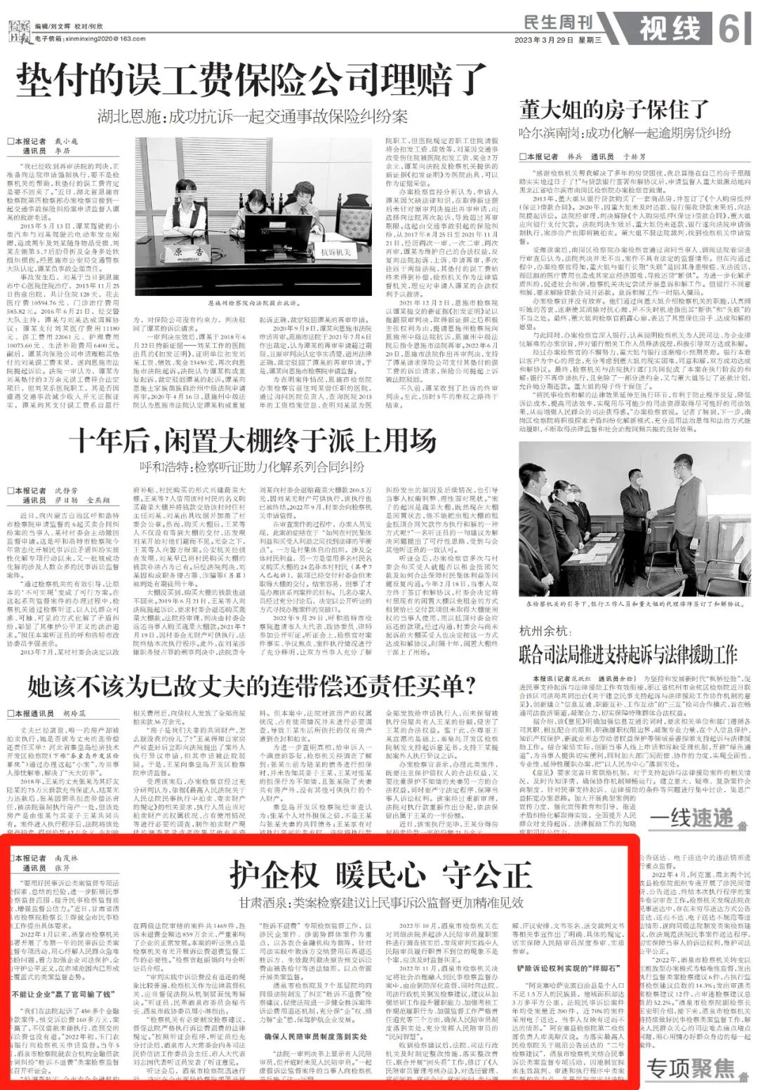 2023年3月29日,检察日报民生周刊刊发《护企权 暖民心 守公正——甘肃酒泉:类案检察建议让民事诉讼监督更加精准见效》。