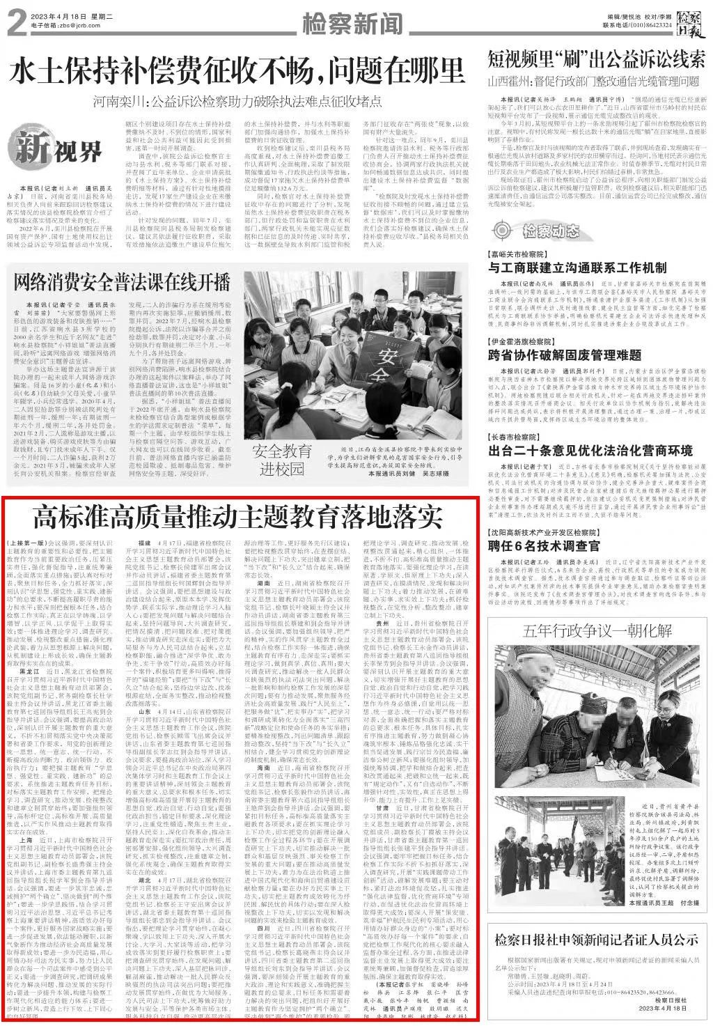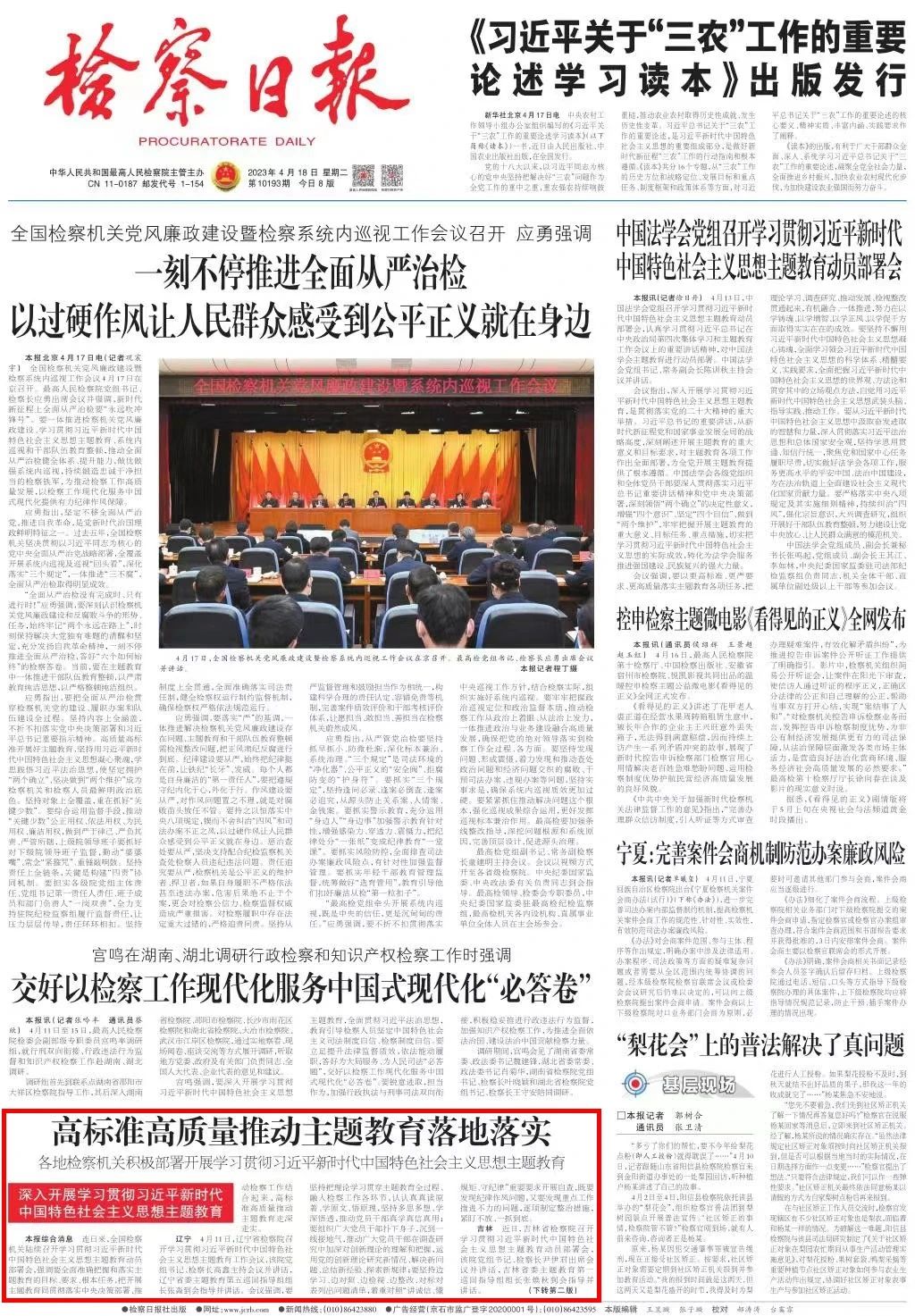 2023年4月18日,检察日报刊发《高标准高质量推动主题教育落地落实——各地检察机关积极部署开展学习贯彻习近平新时代中国特色社会主义思想主题教育》。