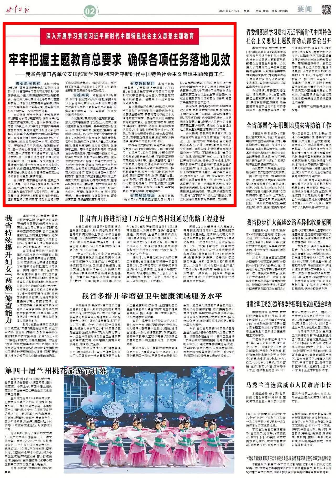 2023年4月17日,甘肃日报二版刊发《牢牢把握主题教育总要求 确保各项任务落地见效——我省各部门各单位安排部署学习贯彻习近平新时代中国特色社会主义思想主题教育工作》。