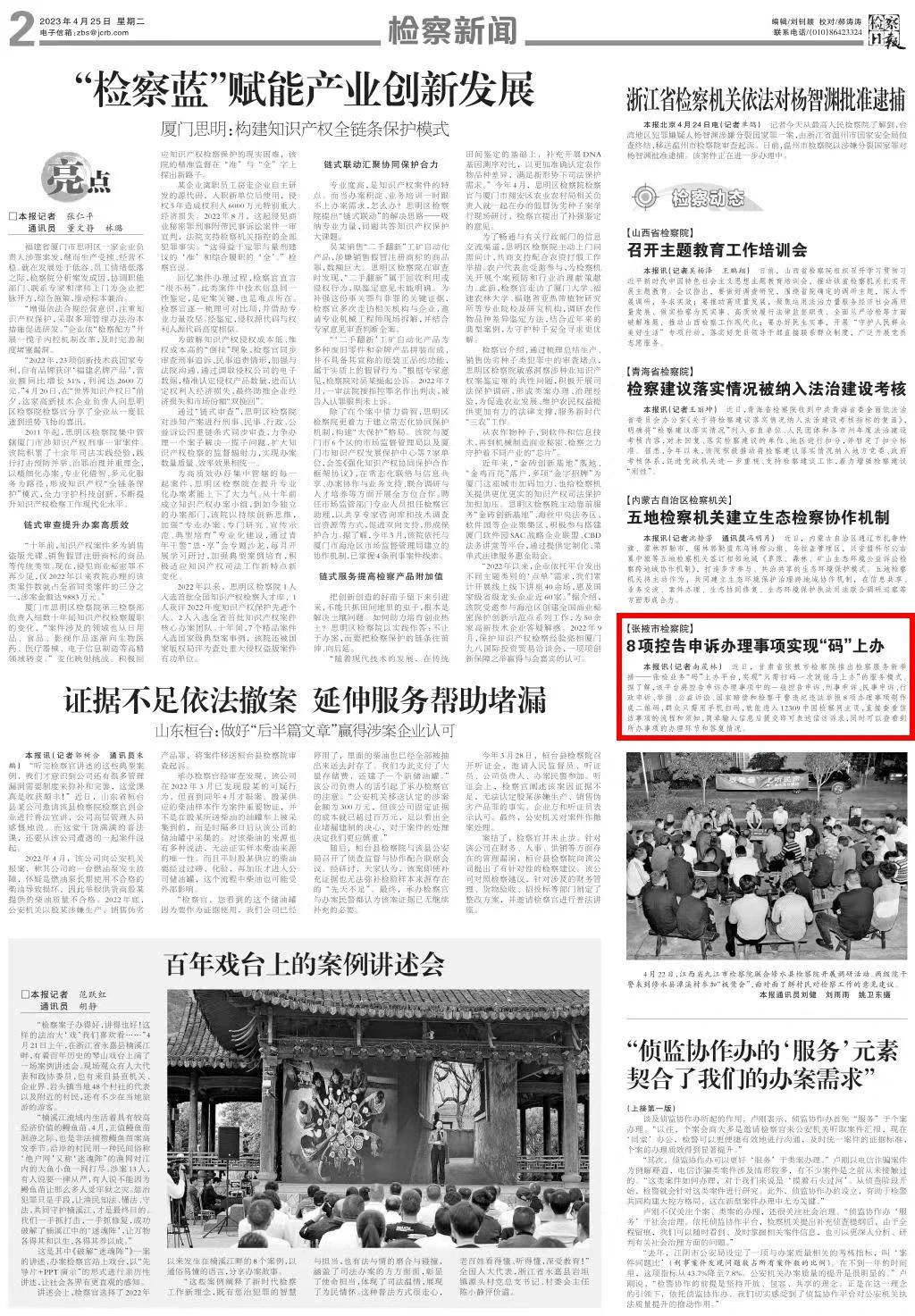 2023年4月25日,检察日报二版刊发《张掖市司机社:8项控告申诉办理事项实现“码”上办。