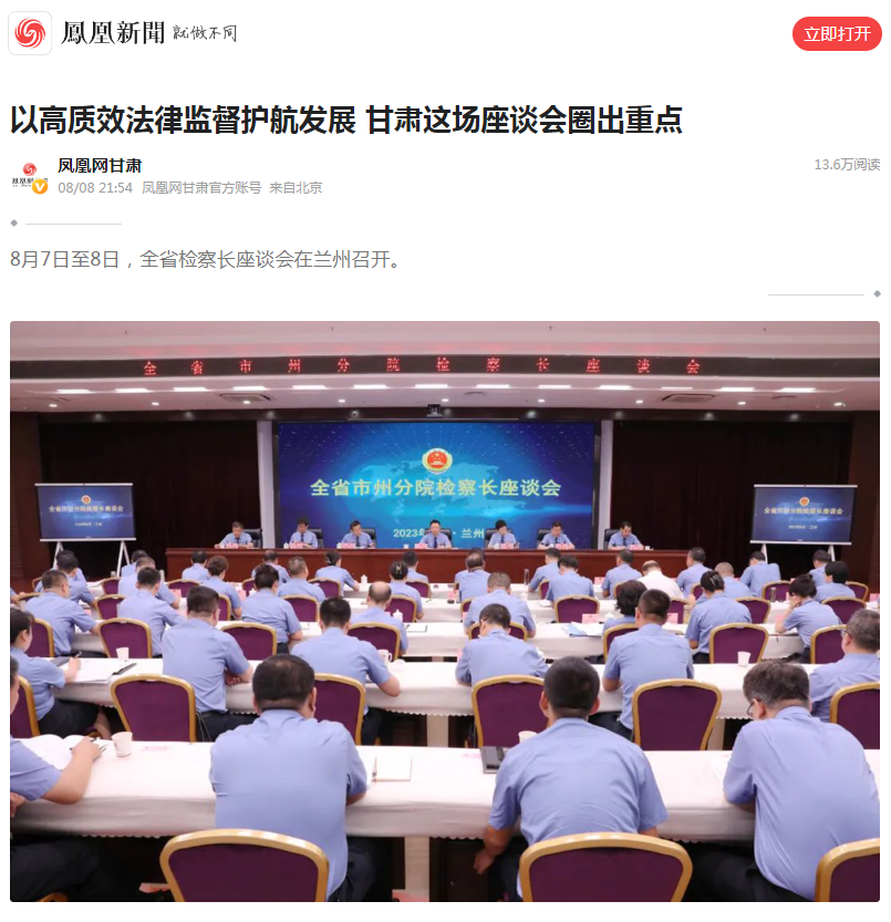 2023年8月8日,凤凰网发布《以高质效法律监督护航发展 甘肃这场座谈会圈出重点》。