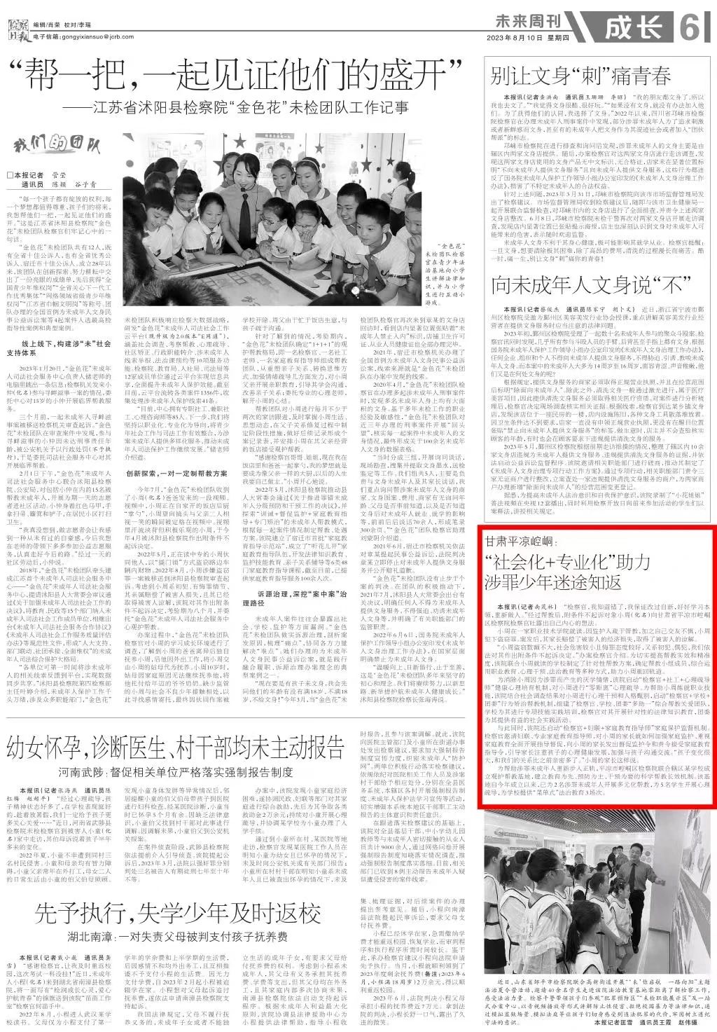 2023年8月10日,检察日报未来周刊刊发《甘肃平凉崆峒:“社会化+专业化”助力涉罪少年迷途知返》。