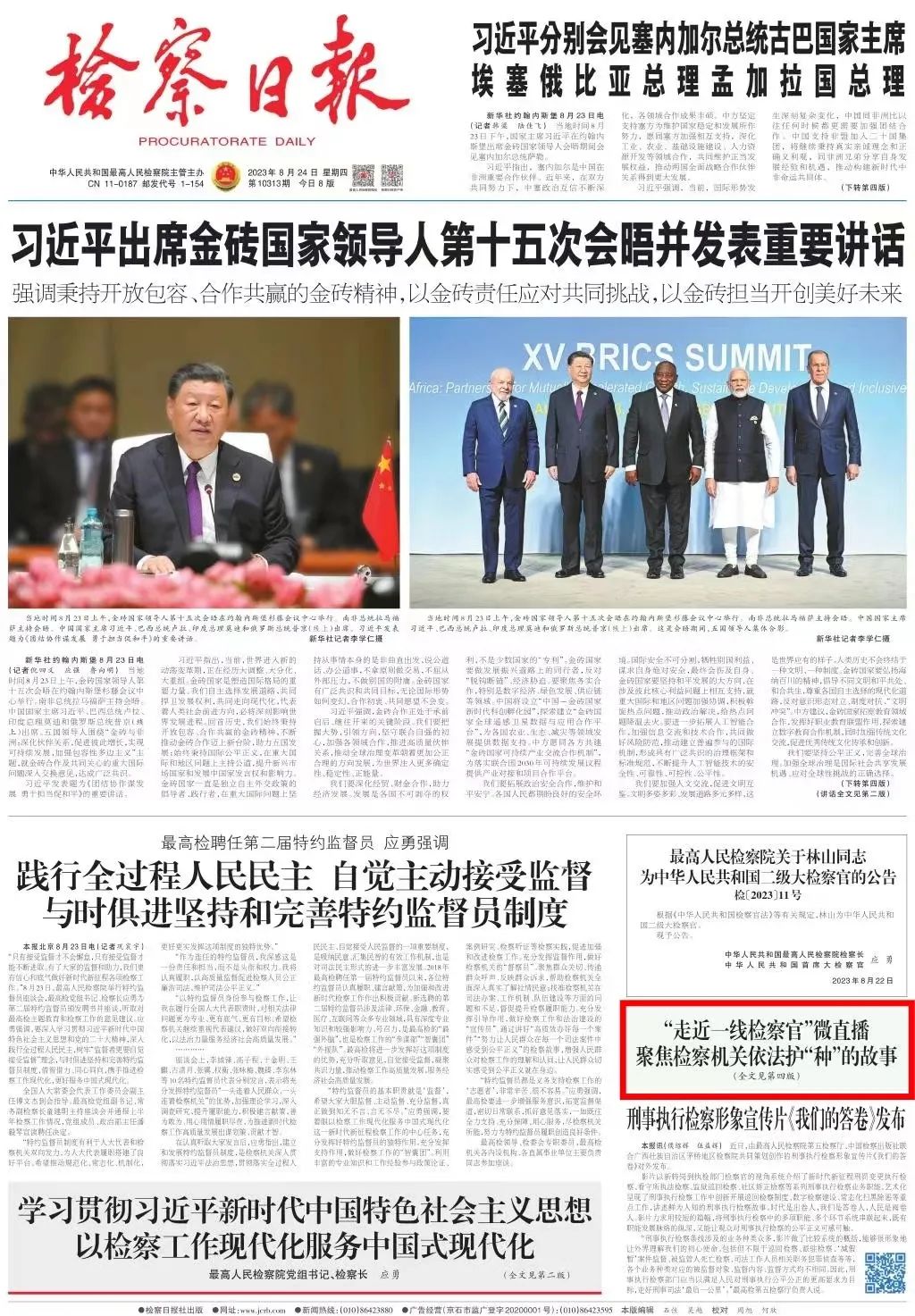 2023年8月24日,检察日报头版刊发《“走近一线检察官”微直播聚焦检察机关依法护“种”的故事》。