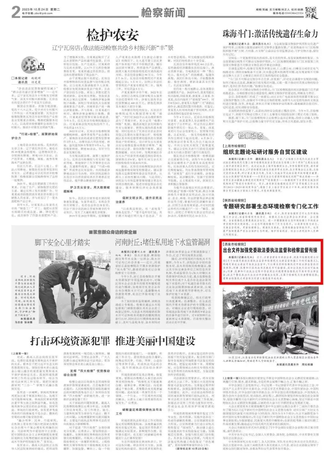2023年10月24日,检察日报刊发《甘肃酒泉:出台文件加强党委政法委执法监督和检察监督衔接》。