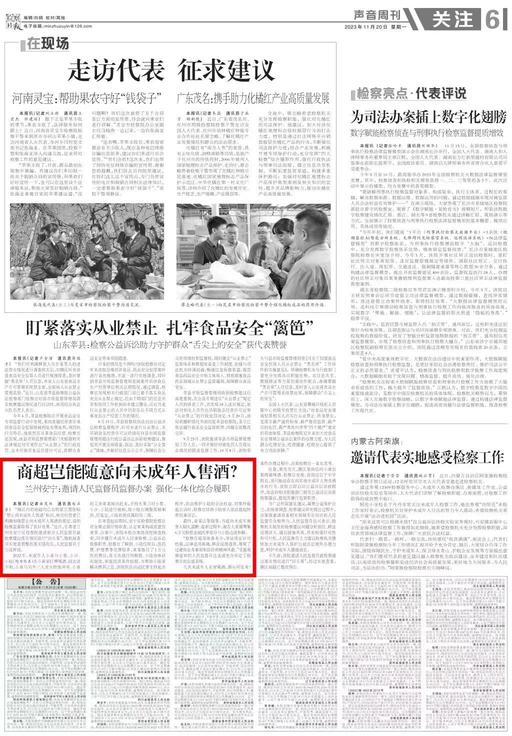 2023年11月20日,检察日报声音周刊刊发《商超岂能随意向未成年人售酒?——兰州安宁:邀请人民监督员监督办案 强化一体化综合履职》。