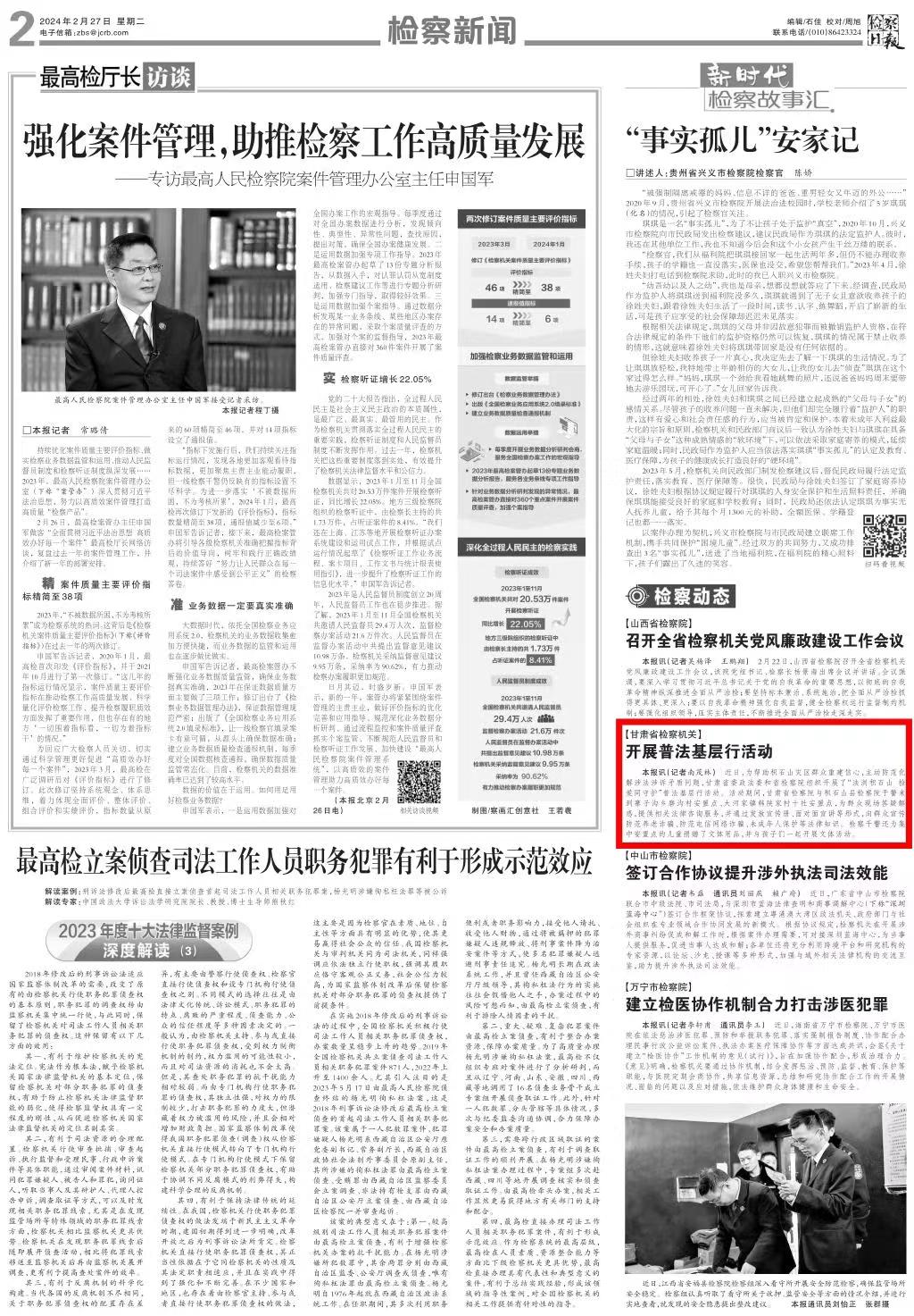 2024年2月27日,检察日报刊发《甘肃省检察机关:开展普法基层行活动》。