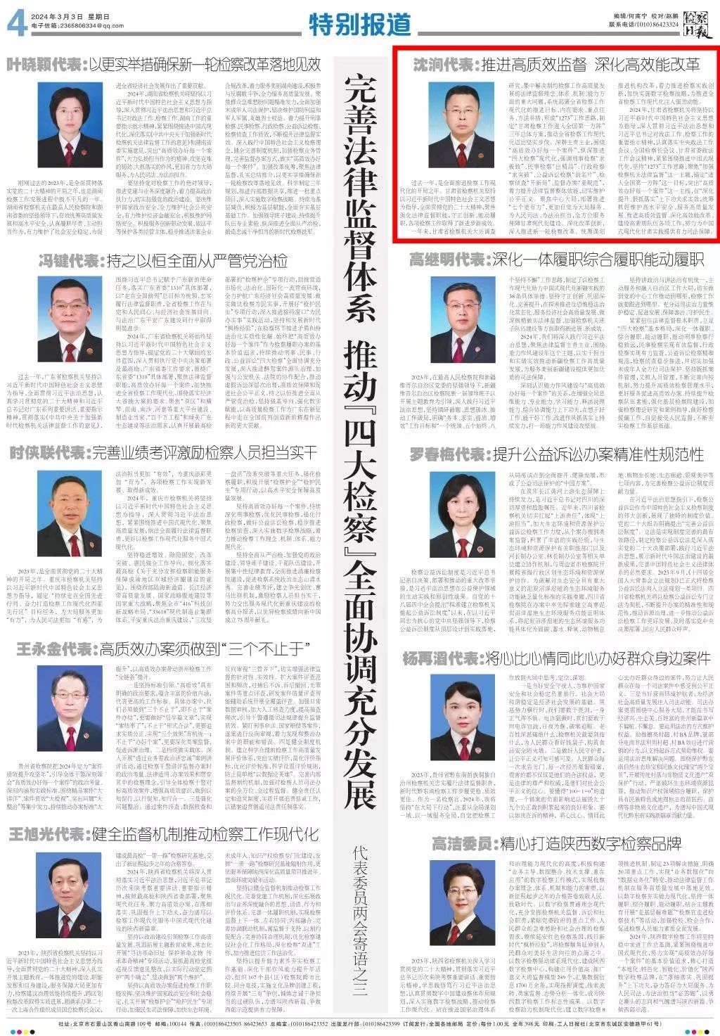 2024年3月3日,检察日报特别报道刊发《沈涧代表:推进高质效监督 深化高效能改革》。