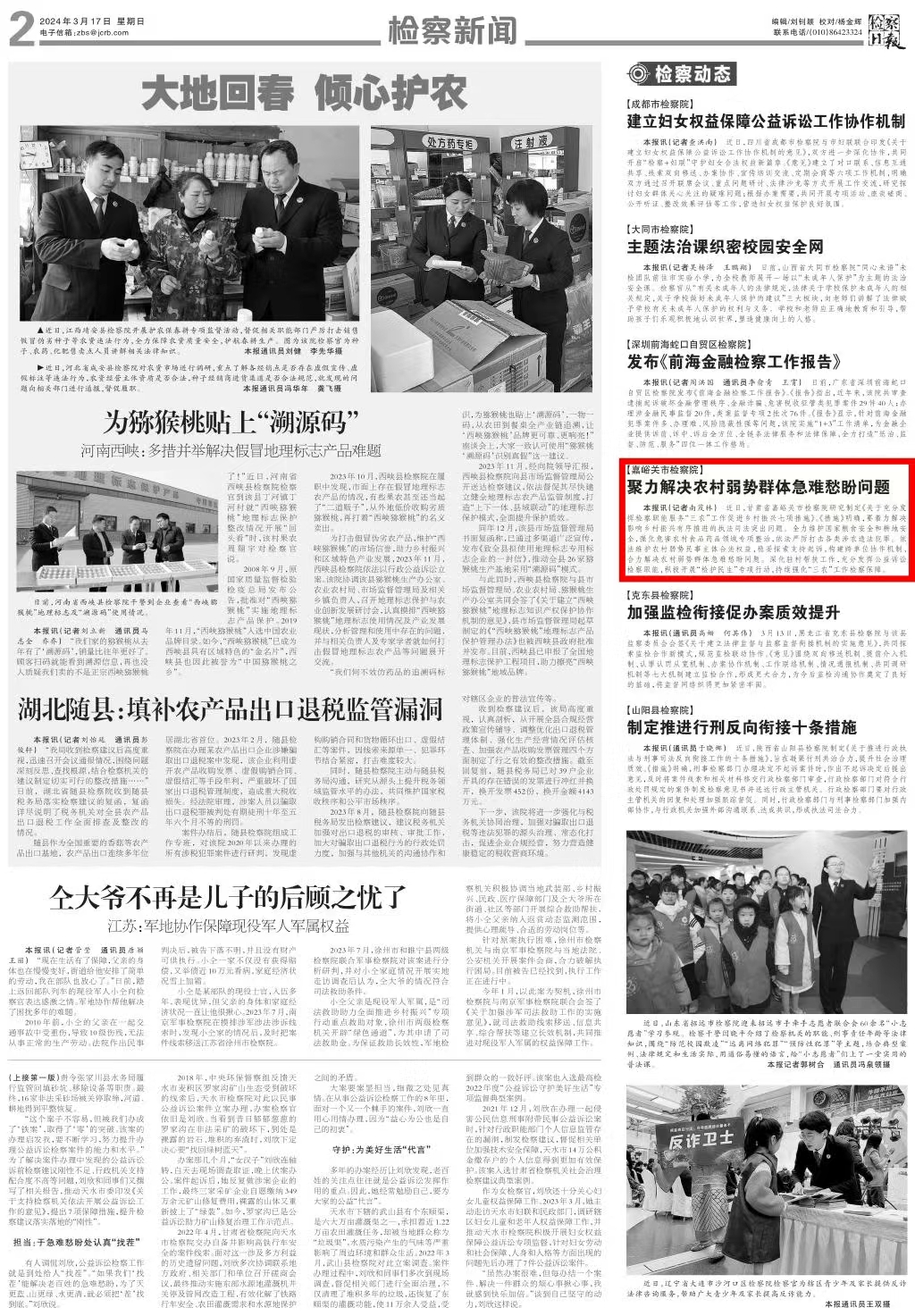 2024年3月17日,检察日报刊发《嘉峪关市司机社:聚力解决农村弱势群体急难愁盼问题》。