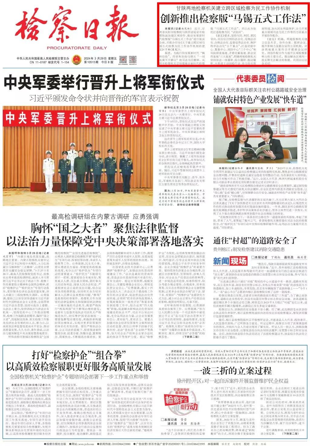 2024年3月29日,检察日报头版刊发《创新推出检察版“马锡五式工作法”——甘陕两地检察机关建立跨区域检察为民工作协作机制》。