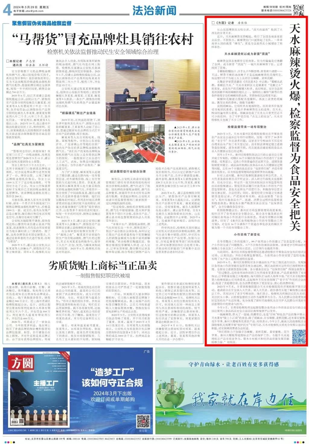 2024年3月29日,检察日报刊发《天水麻辣烫火爆,检察监督为食品安全把关》。