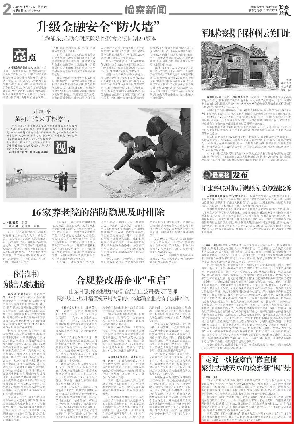 2024年4月13日,检察日报头版刊发《“走近一线检察官”微直播 聚焦古城天水的检察新“枫”景》。