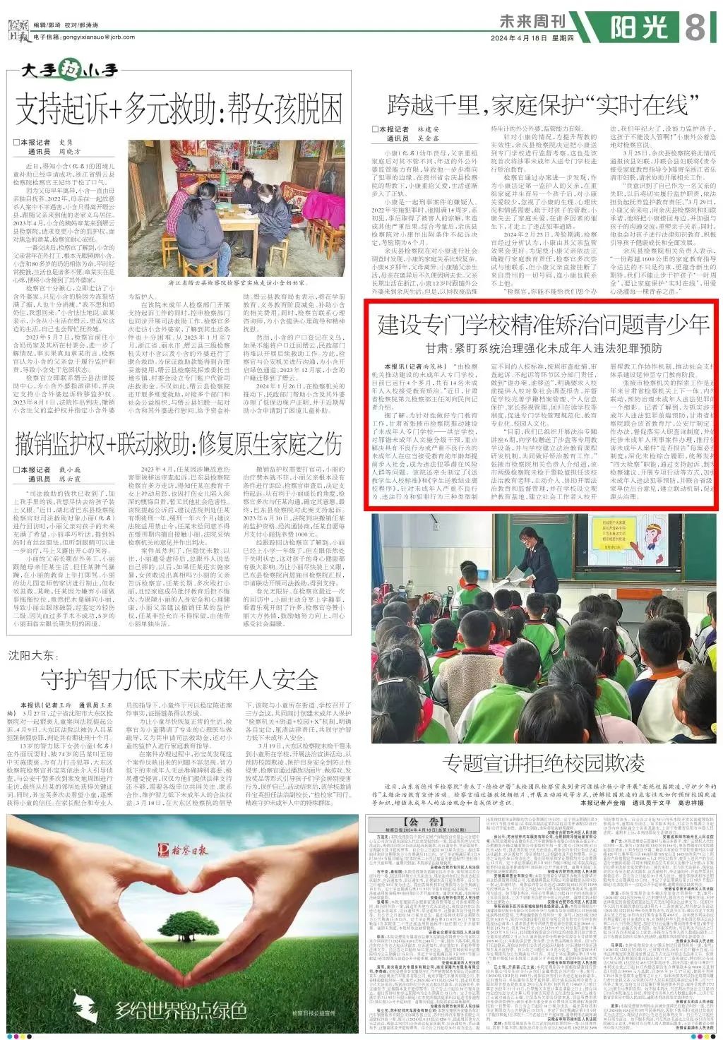 2024年4月18日,检察日报未来周刊刊发《建设专门学校精准矫治问题青少年——甘肃:紧盯系统治理强化未成年人违法犯罪预防》。