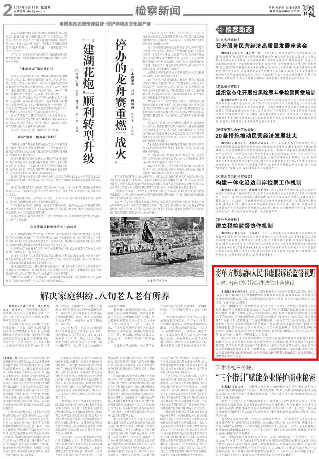 2024年6月13日,检察日报刊发《将单方欺骗纳入民事虚假诉讼监督视野——甘肃:出台〈指引〉促进诚信社会建设》。