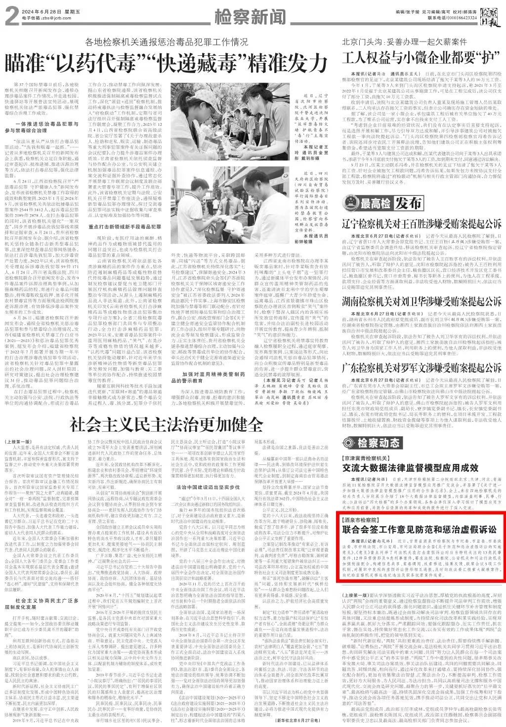 2024年6月28日,检察日报刊发《酒泉市司机社:联合会签工作意见防范和惩治虚假诉讼》。