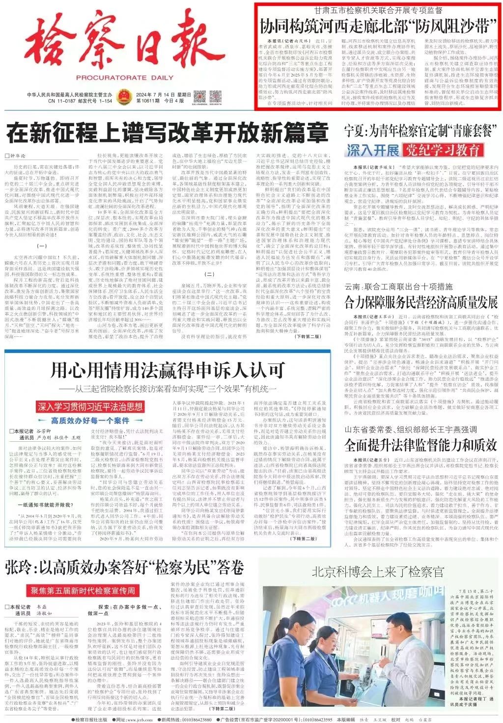 2024年7月14日,检察日报头版刊发《甘肃五市检察机关联合开展专项监督——协同构筑河西走廊北部“防风阻沙带”》。