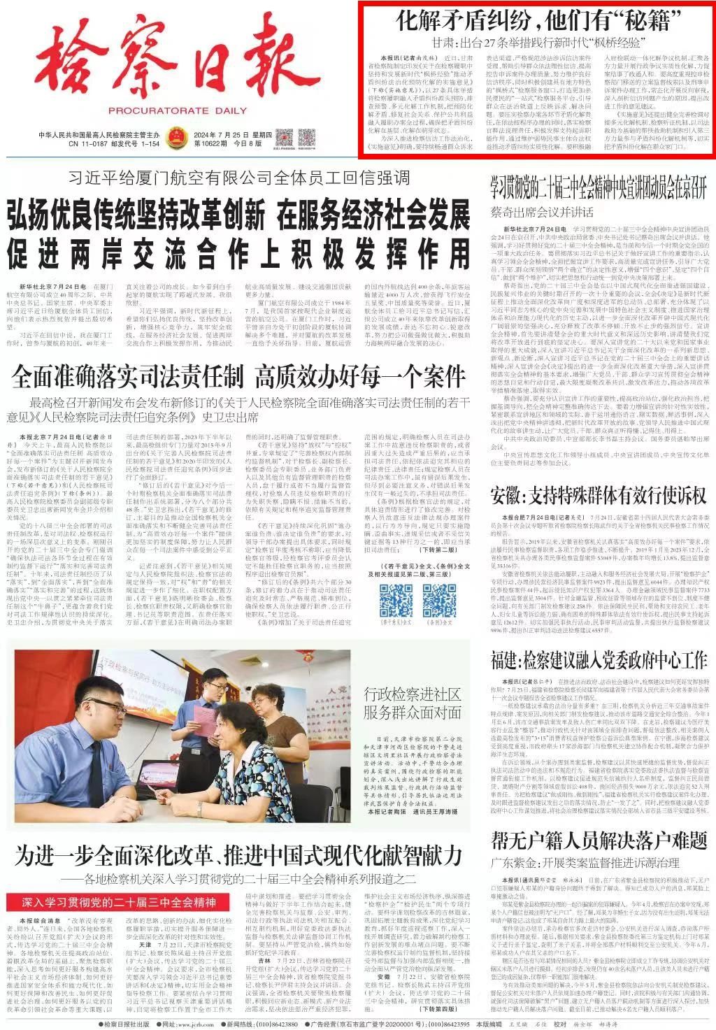 2024年7月25日,检察日报头版刊发《化解矛盾纠纷,他们有“秘籍”——甘肃:出台27条举措践行新时代“枫桥经验”》。