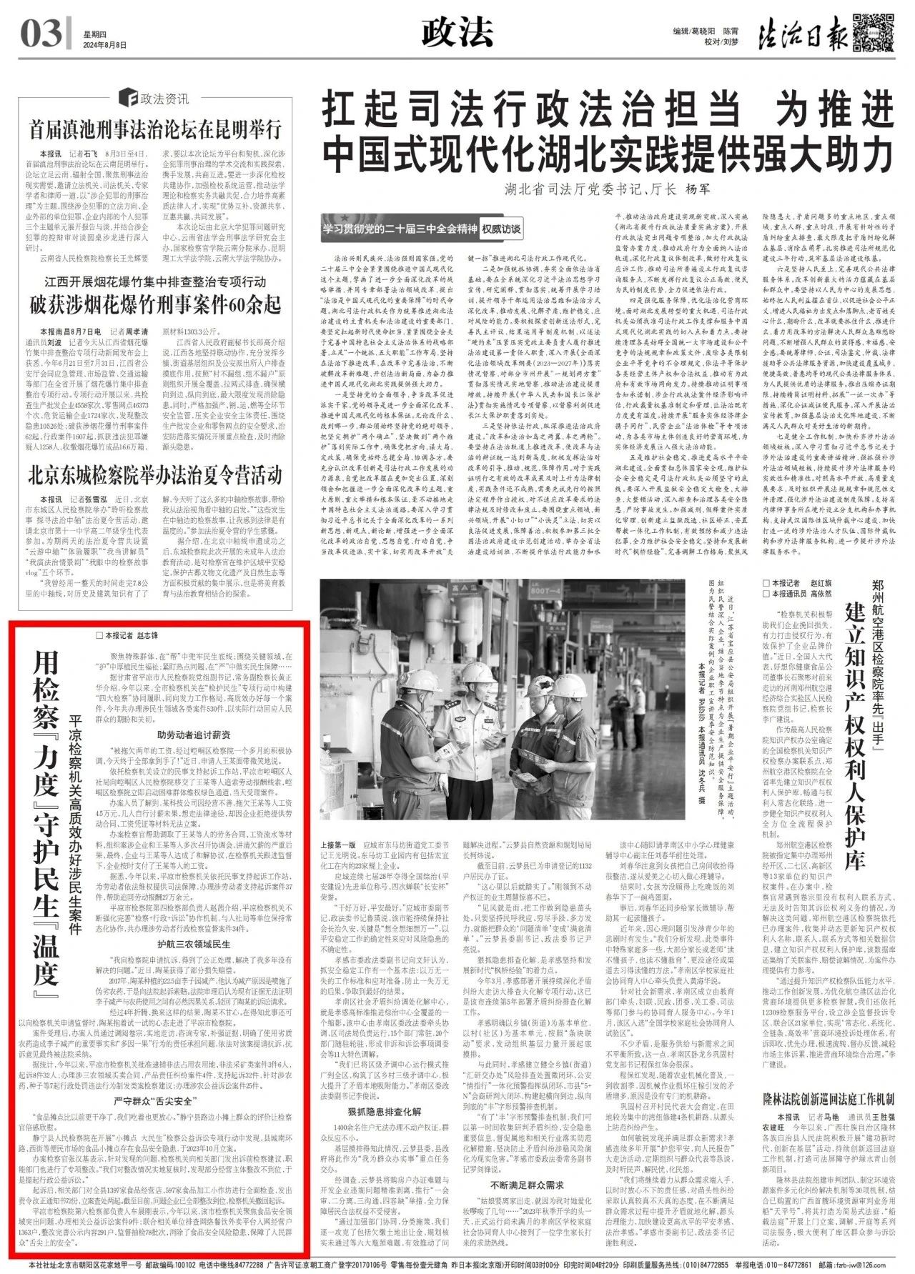 2024年8月8日,法治日报刊发《用检察“力度”守护民生“温度”——平凉检察机关高质效办好涉民生案件》。