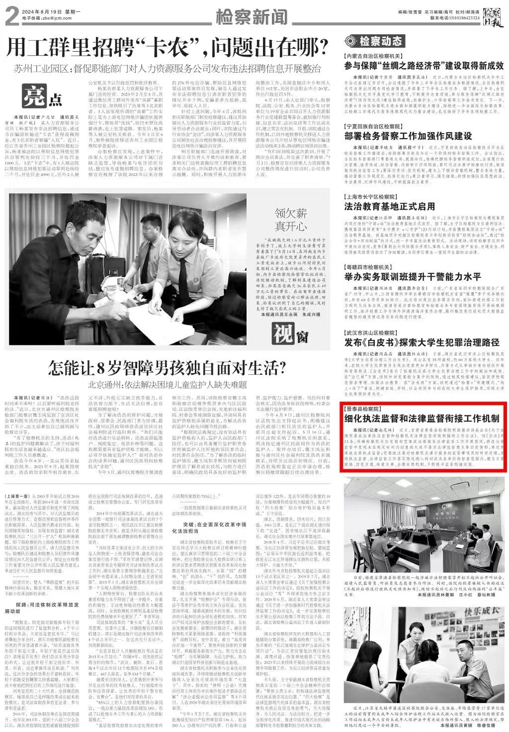 2024年8月19日,检察日报刊发《景泰县司机社:细化执法监督和法律监督衔接工作机制》。