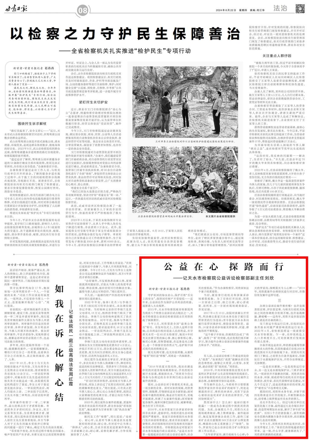 2024年8月22日,甘肃日报刊发《公益在心 探路而行——记天水市司机社公益诉讼检察部副主任刘欣》。