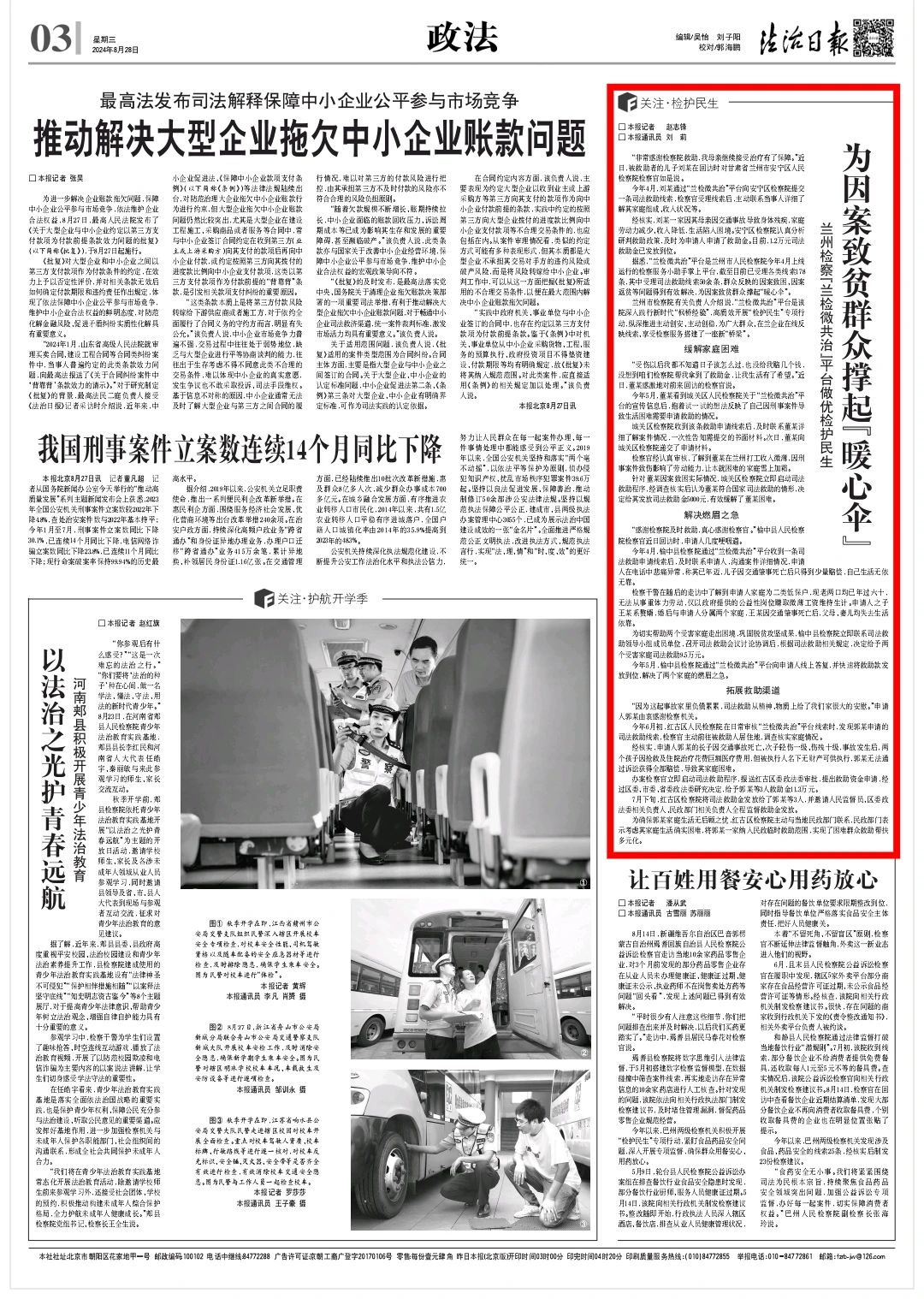 2024年8月28日,法治日报刊发《为因案致贫群众撑起“暖心伞”——兰州检察“兰检微共治”平台做优检护民生》。