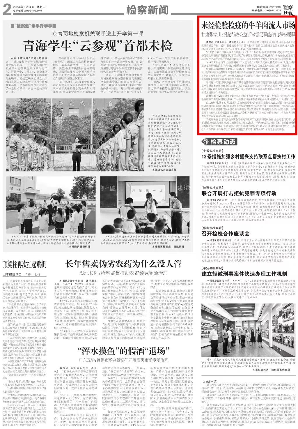 2024年9月4日,检察日报刊发《未经检验检疫的牛羊肉流入市场——甘肃张家川:提起行政公益诉讼督促职能部门积极履职》。