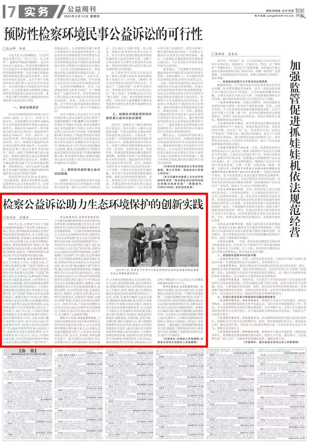 2024年9月12日,检察日报公益周刊刊发《检察公益诉讼助力生态环境保护的创新实践》。
